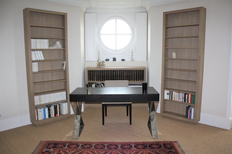 Bibliothèque et aménagement de bureau - Chantilly - Oise 60 Chêne massif (Oise- 60) Bibliothèques en chêne massif, dos en contreplaqué placage chêne. Teinte à l’alcool et vernis mat.