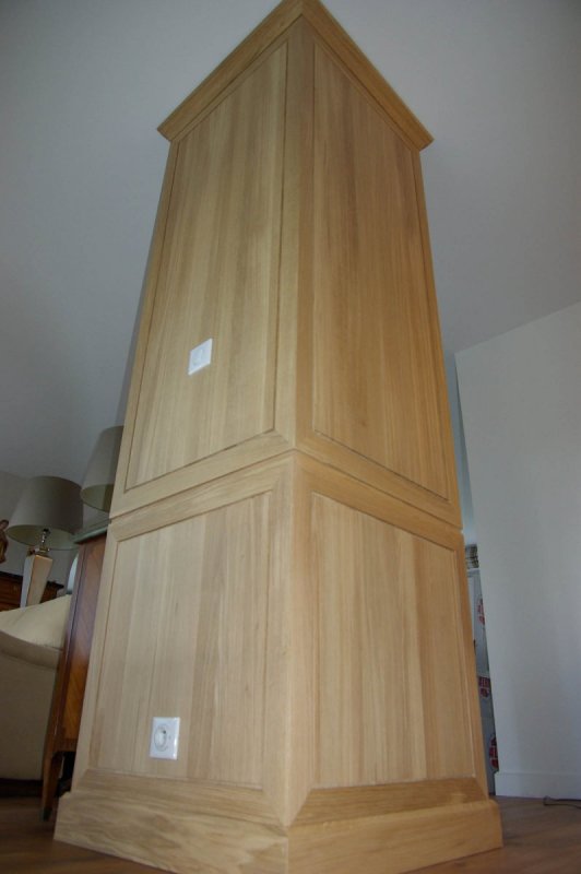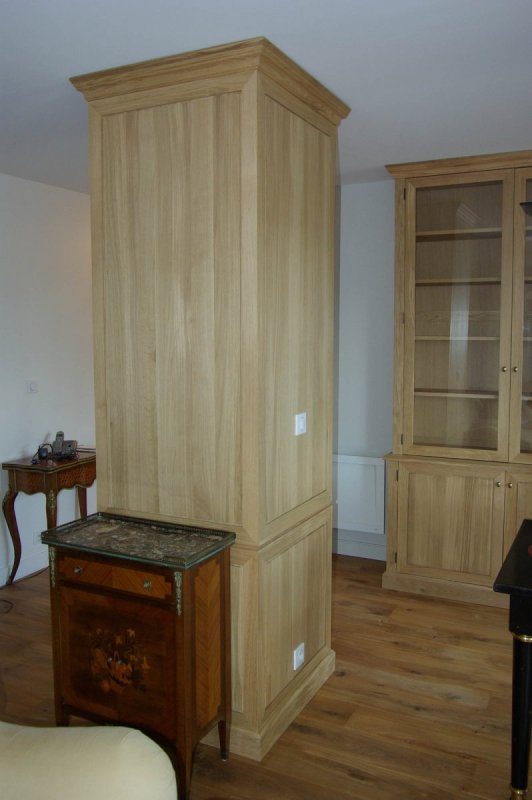 - Habillage de la colonne-gaine technique en panneautage de chêne massif.