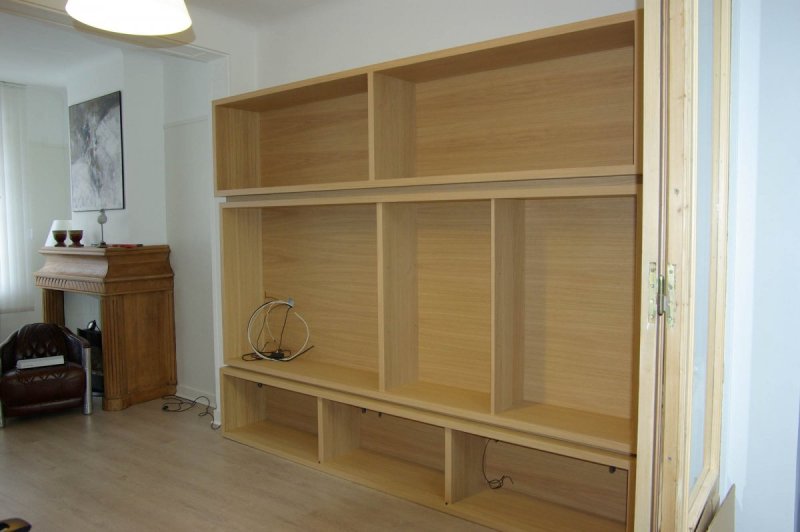 Bibliothèque et meuble TV - Amiens - Somme 80 Placage chêne (Somme 80) Meuble sur mesure en latté placage chêne. Vernis mat. Panneaux coulissants en laque acrylique.
