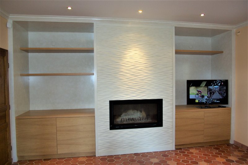 - Un caisson à bûches, des tiroirs de rangement classiques et spécifiques pour CD etDVD ainsi que bar apéritif.