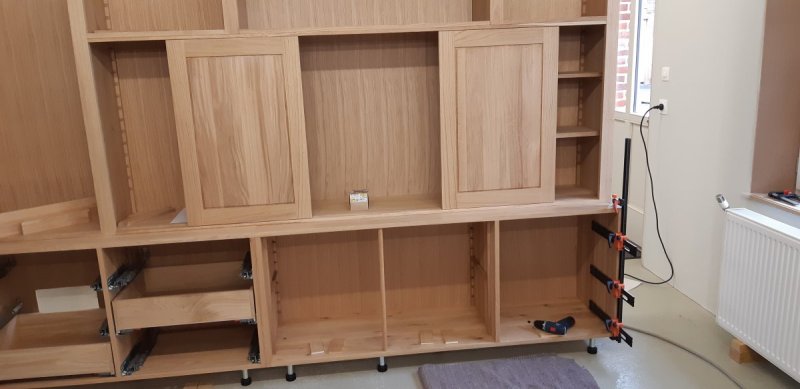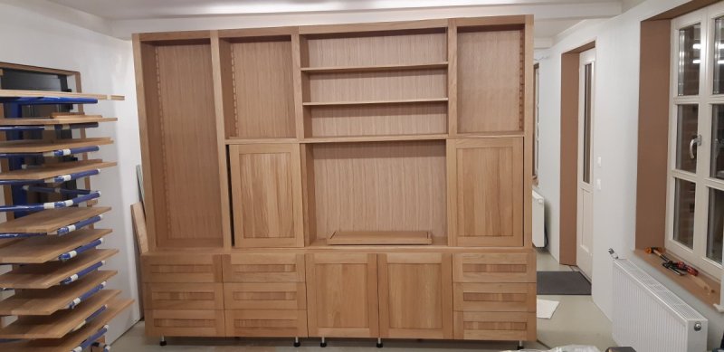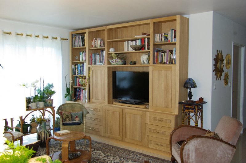 Bibliothèque meuble TV - Ferrières en Brie - Seine et Marne 77 Chêne massif (Seine et Marne 77) Bibliothèque en chêne massif sur mesure. Tiroirs sur coulisses à fermeture amortie Blum et panneaux coulissants. Finition cire naturelle.