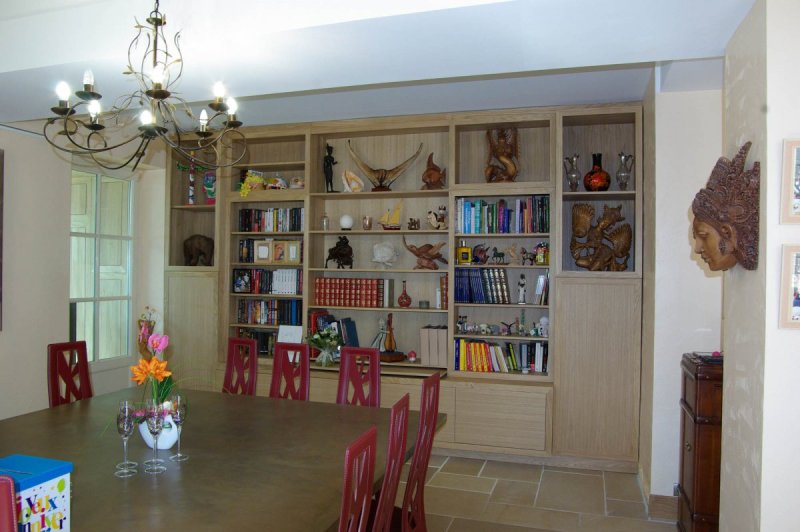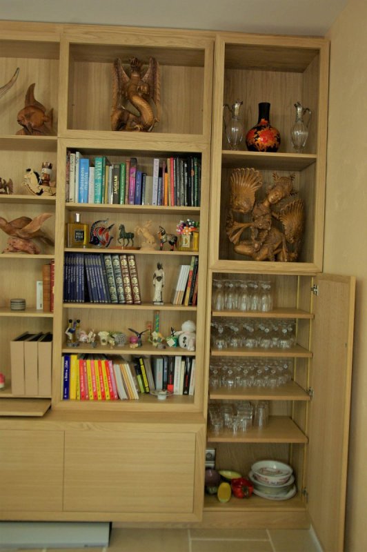 Bibliothèque et rangements - Senlis - Oise 60 Chêne massif (Oise-60) Meuble sur mesure en chêne massif, dos en contreplaqué placage chêne. Aménagement d’un plateau coulissant pour l’ordinateur portable. Finition vernis mat incolore.