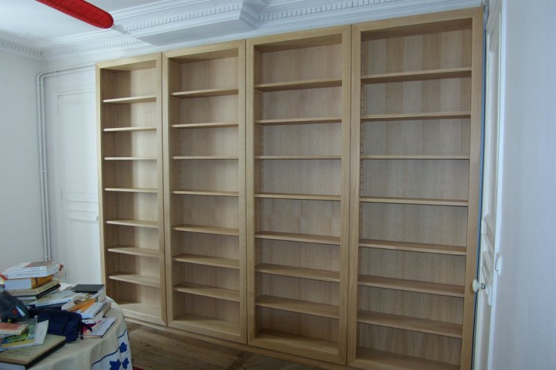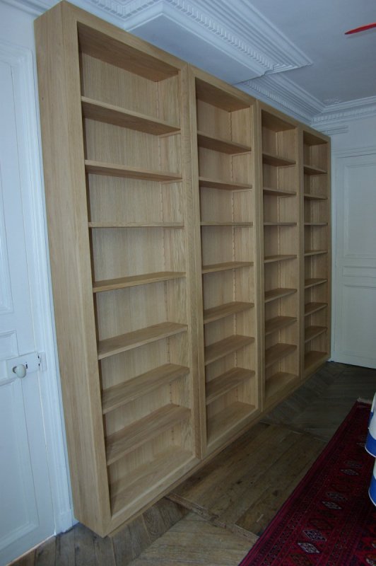Bibliothèque - Paris 6ème Chêne massif (Ile de France 75) Meuble en chêne massif, dos en contreplaqué placage chêne. Ensemble de quatre corps. Vernis mat.