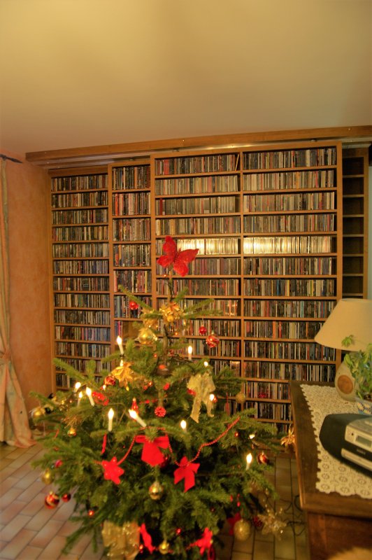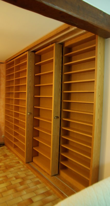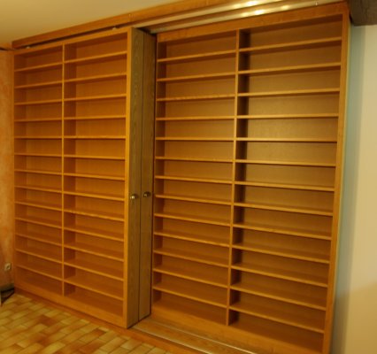 Cdthèque - Fouquenies - Oise 60 Médium plaqué merisier ébénisterie (Oise 60) Cdthèque en médium laqué et placage merisier ébénisterie verni. Trois niveaux de rangement. Capacité de 4500 CD. Finition vernis satin. Montage sur rails et profils acier.