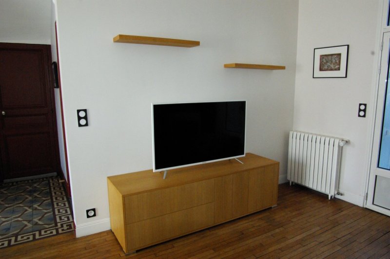 Meuble TV et étagères - Cormeilles en Parisis - Val d’Oise 95 Placage chêne ébénisterie (Val d’Oise-95) Meuble TV sur piètement chromé Deux portes battantes pousse-lâche Tiroirs équipés de profils à CD sur système pousse-lâche