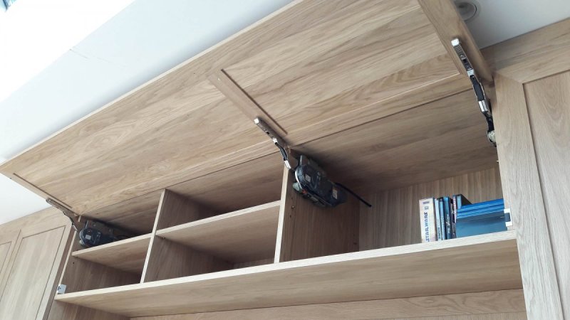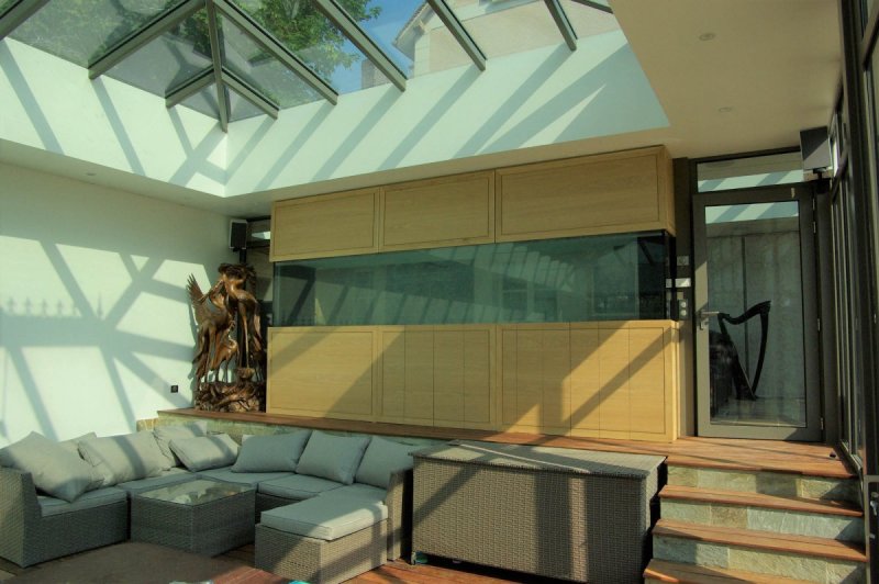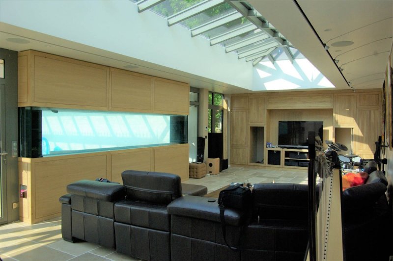 Meuble TV et Home-cinéma - Senlis - Oise 60 Chêne massif (Oise-60) Meuble sur mesure en chêne massif, dos en contreplaqué placage chêne. Finition cire naturelle. Habillage de l’aquarium attenant en panneaux chêne placage et massif.
