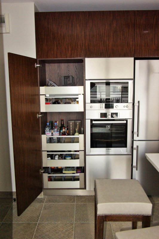 Espace froid et cuisson, façades inox et placage wengé de chez Marotte finition vernis brillant perlé. Ces façades sont équipées de systèmes d’ouverture pousse-lâche.