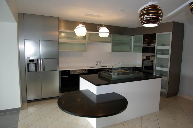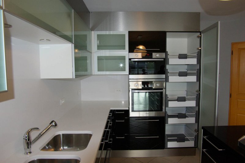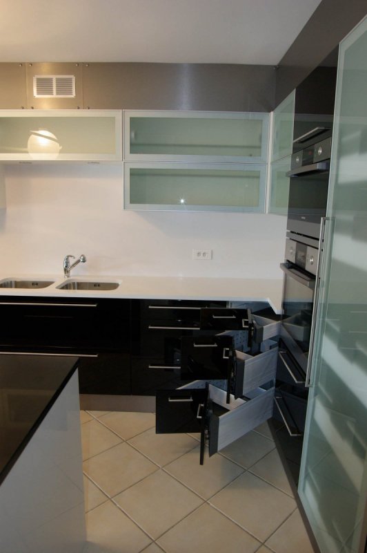 Tous les meubles hauts sont équipés de motorisation système servo-drive Blum. Une simple impulsion permet l’ouverture ou la fermeture des portes. Une protection anti collision est prévue pour l’angle !