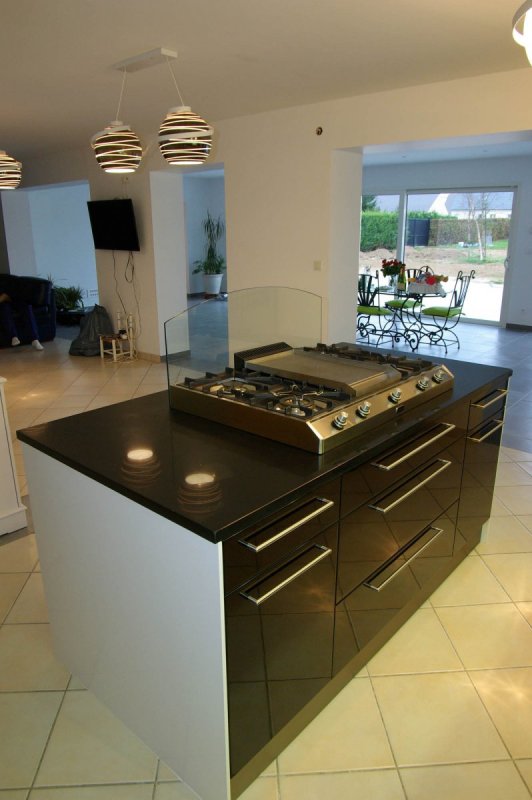 Ilôt, plan de travail et crédence sont en quartz Cosentino.