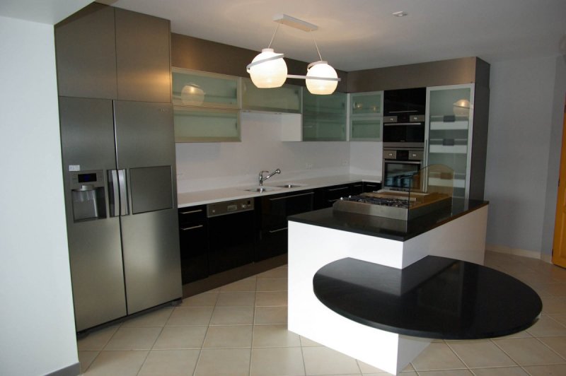 Les caissons sont en stratifié perlé blanc avec chants abs noirs en harmonie avec les façades en finition laque peinte noire.