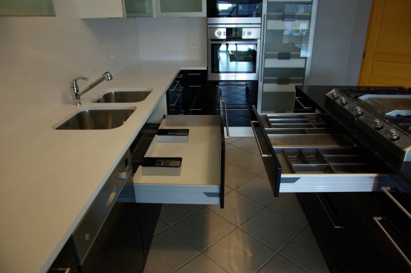 Ouvrants et éléments coulissants système tandembox Blum, équipement orgaline inox.