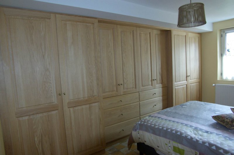 Dressing en chêne massif - Conteville - Oise 60 Chêne massif (Oise-60) Grand dressing sur mesure en chêne massif. Tiroirs sur coulisses movento Blum. Finition cire naturelle.