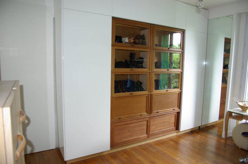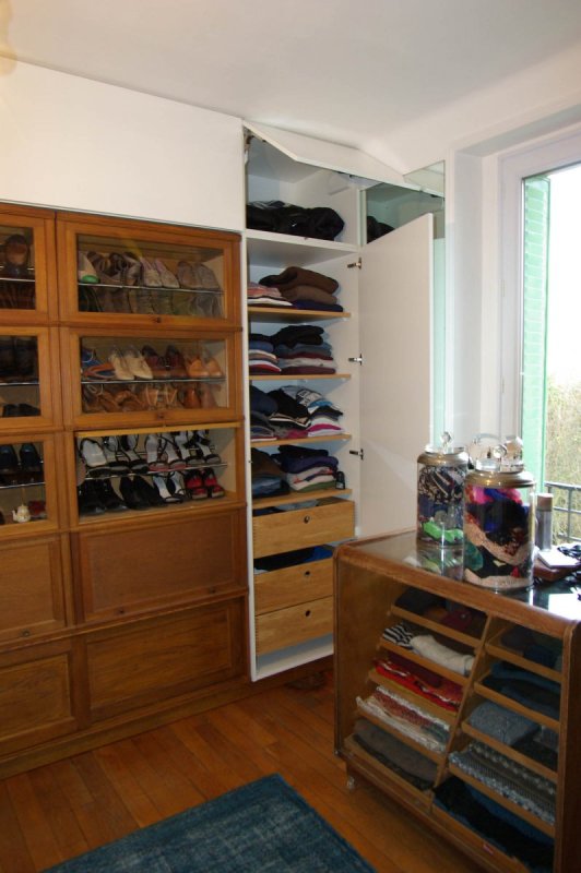 - Ces caissons enchâssent un ensemble de meubles de mercerie servant de rangement à chaussures, chinés en brocante, en finition chêne ciré.