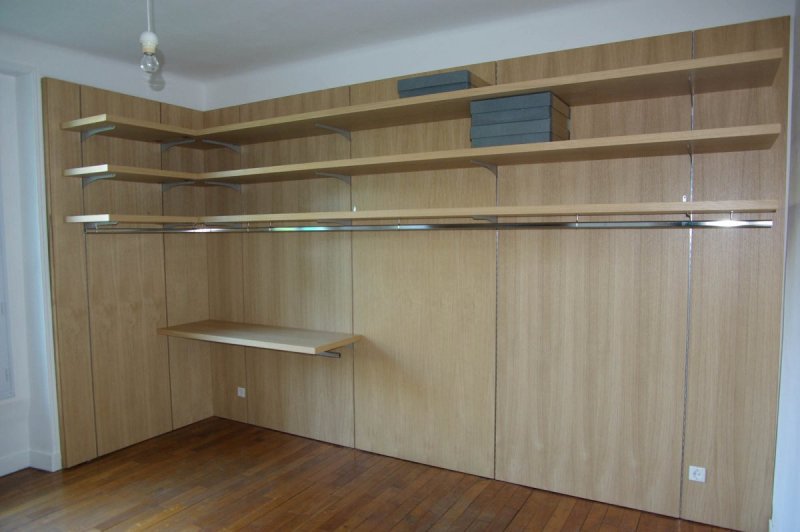 - Panneautage des murs et grande étagères en latté placage chêne, finition cire naturelle.