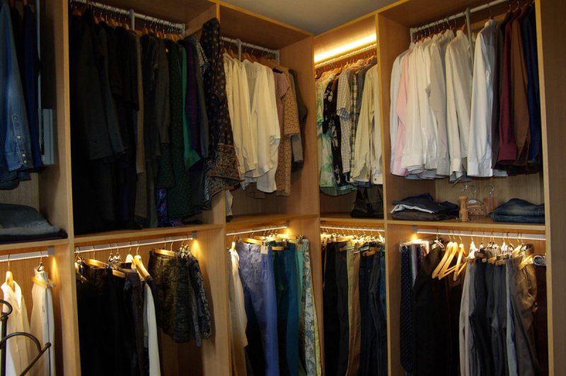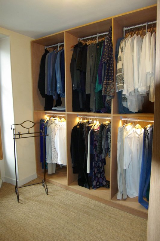 Dressing en pièce dédiée - Amiens - Somme 80 Placage chêne ébénisterie (Somme-80) Tour de pièce en placage chêne ébénisterie, finition cire naturelle. Barres de penderie avec éclairage intégré