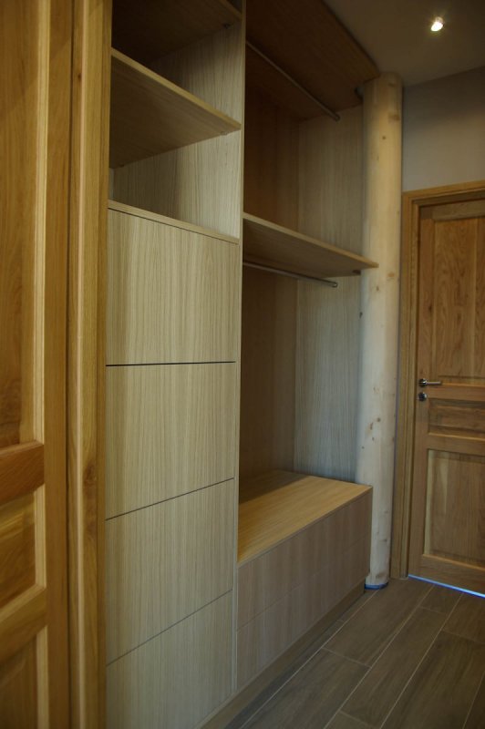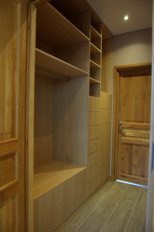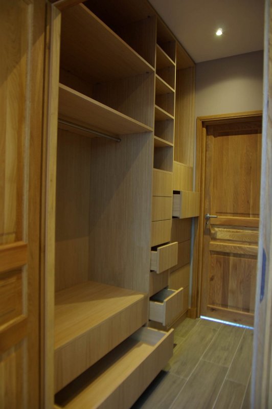 Dressing - Senlis - Oise 60 Placage chêne ébénisterie (Oise-60) Dressing sur mesure en latté placage chêne vernis mat. Tiroirs sur coulisses tip-on movento Blum. Vis-à-vis Madame-Monsieur.