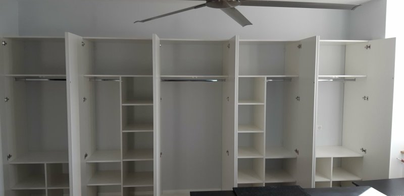 Grand dressing symétrique-Amiens-Somme 80 Grand dressing à portes battantes Charnières Blum à fermeture amortie Structure symétrique, côté homme et côté femme Réalisation en mélaminé blanc mat de chez Egger