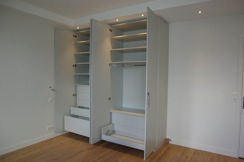 Petit dressing pour chambre d’enfant - Colombes - Hauts de seine 92 Mélaminé (Hauts de Seine-92) Dressing sur mesure pour une chambre d’enfant. Tiroirs sur coulisses movento Blum Mélaminé « bleu polaire » de chez Egger