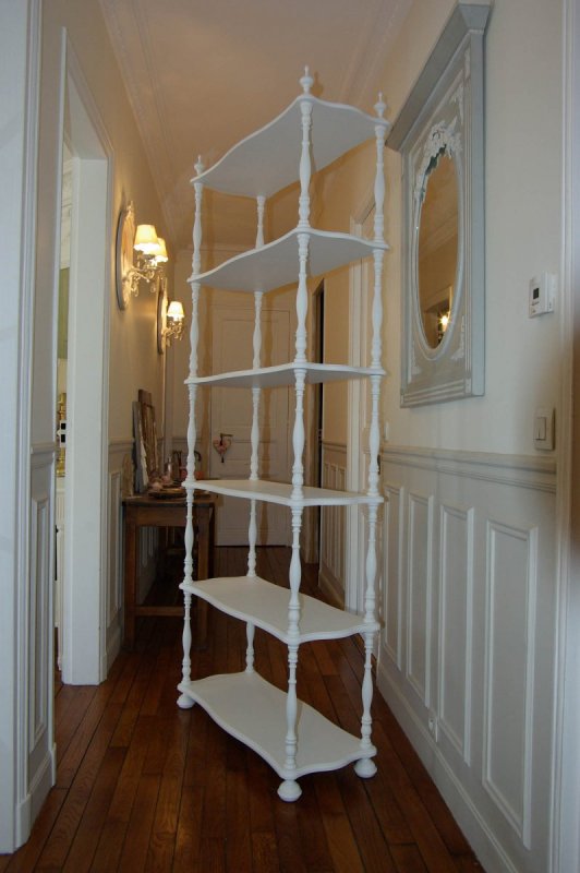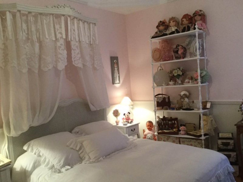 Ensemble d’étagères à colonnettes sur mesure pour une collection de poupées.