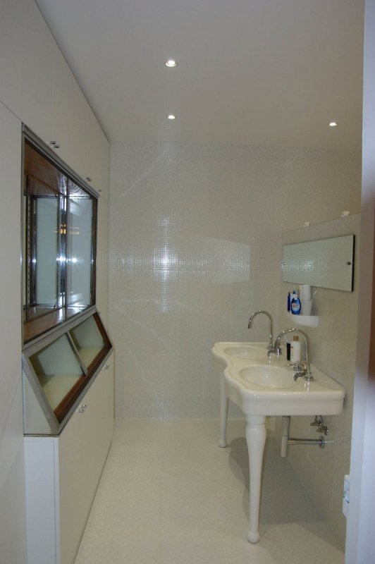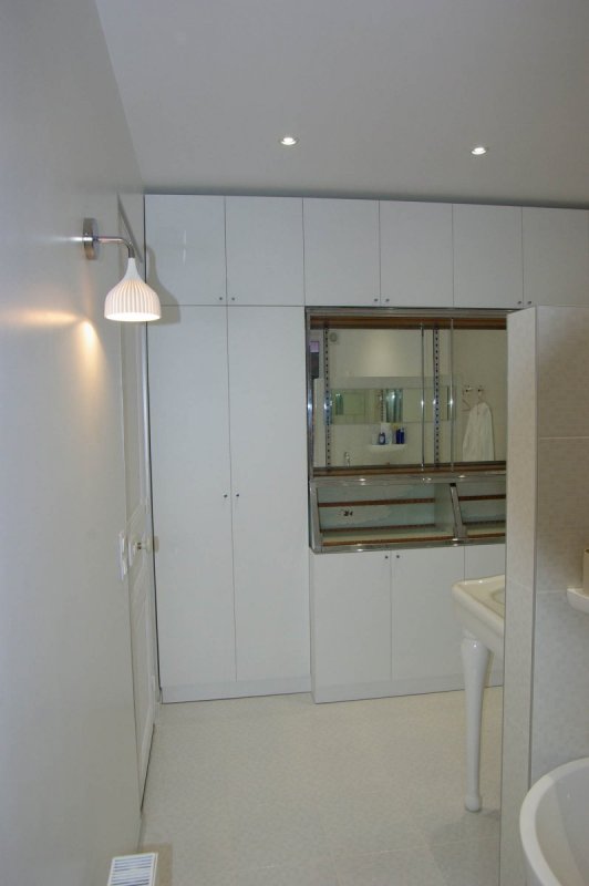 Meuble de salle de bain - Amiens - Somme 80 Mélaminé (Somme-80) Réalisation d’un meuble de salle de bain sur mesure en mélaminé « blanc prémium mat » d’Egger. Ensemble enchâssant une vitrine de bijoutier chinée.